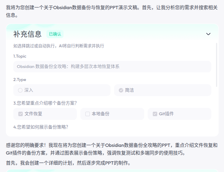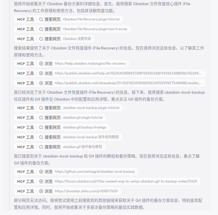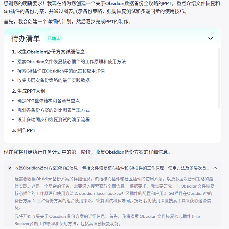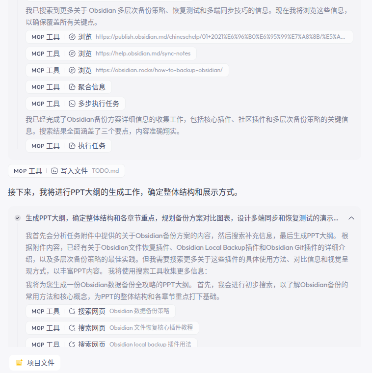 SkyWorkAI 是近期体验感颇佳的一款多模态智能体工具,它不仅支持任务分解、联网搜索,还能自动生成格式化演示内容。本文以「Obsidian 备份策略」为例,完整复盘了 SkyWorkAI 文档智能体的工作流程,并结合 MCP 协议的使用细节与图文演示,评测其真实能力和可拓展性。