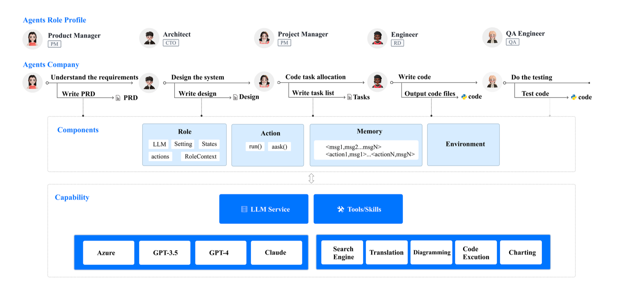 MetaGPT 大体是模拟一家软件公司的开发流程,不过是模拟各个角色让 AI 干活。