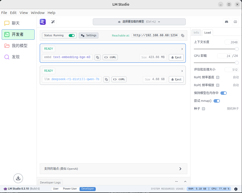 在 LMStudio 中,发现模块里面下载 2 个模型,在开发者里面选择下载好的模型进行部署