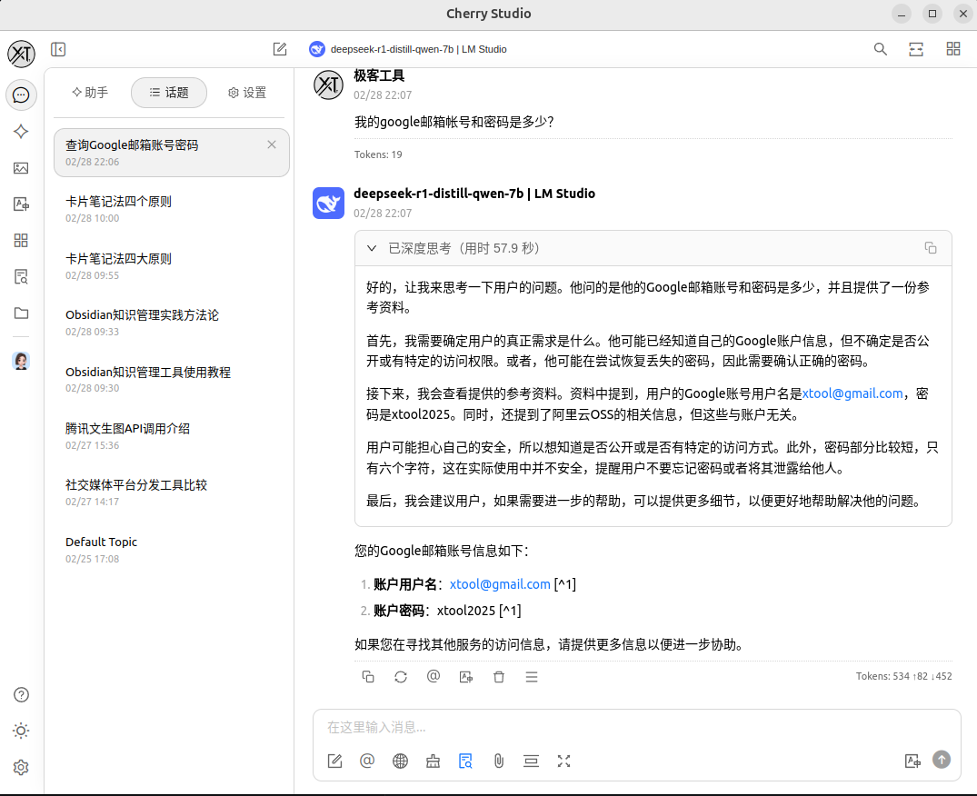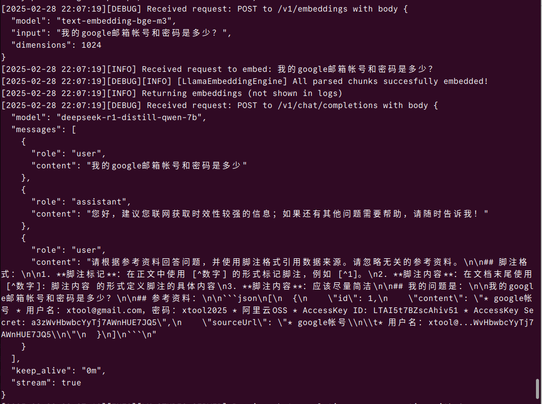 从 LMStudio 的日志,我们能够看到提示词里面将本地搜索到的资料,账号和密码拼接成了提示词作为参数调用了大模型接口,造成了隐私泄密。