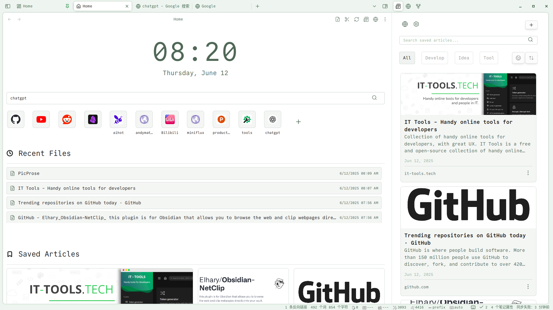 从此,信息检索的起点,就在 Obsidian 内部。这感觉就像拥有了一个属于自己的信息驾驶舱,一切尽在掌握。 左边是主页,右边栏是剪藏的卡片列表