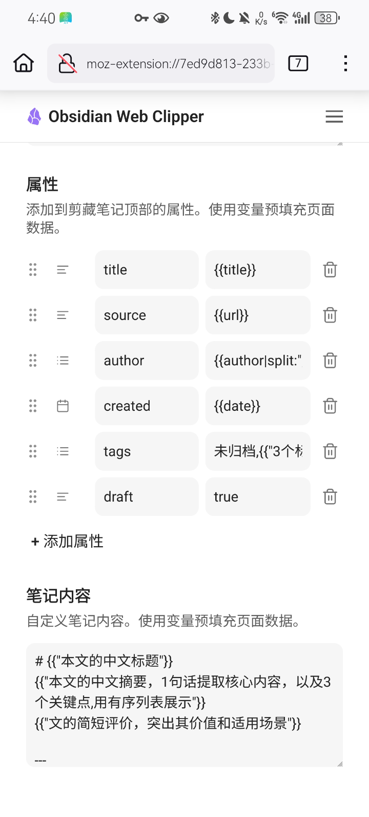 我使用的是 android 系统,安装好 obsidian 和 firefox 浏览器,然后火狐浏览器开启账号同步,在 obsidian clipper 中导入配置