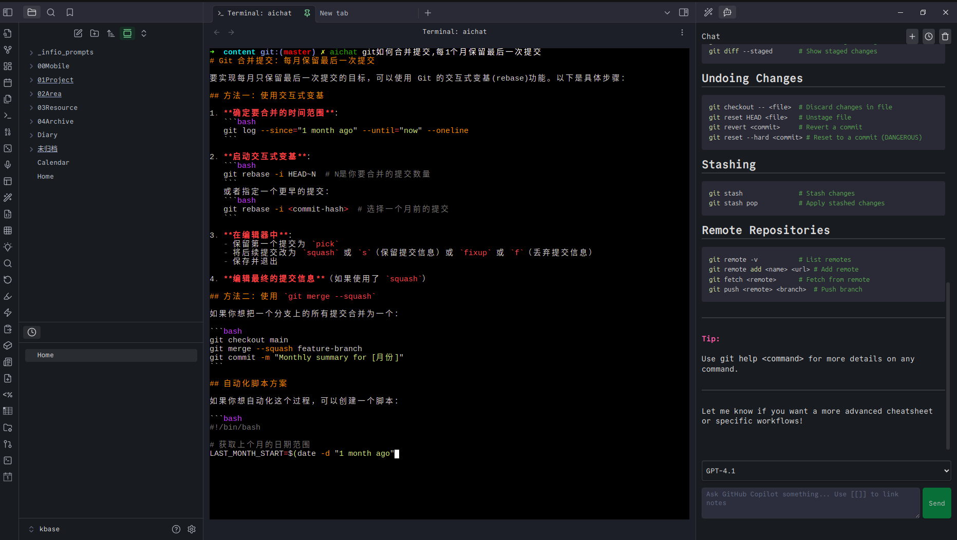 1. 终端输出,无缝衔接:在终端窗口中运行 AI 命令,无论是代码片段、分析报告还是文章润色,其输出都可以被随时复制,甚至直接通过管道符 >>> 写入到知识库内的任一 Markdown 文件中。这打通了 AI 生成内容与知识沉淀之间的 最后一公里