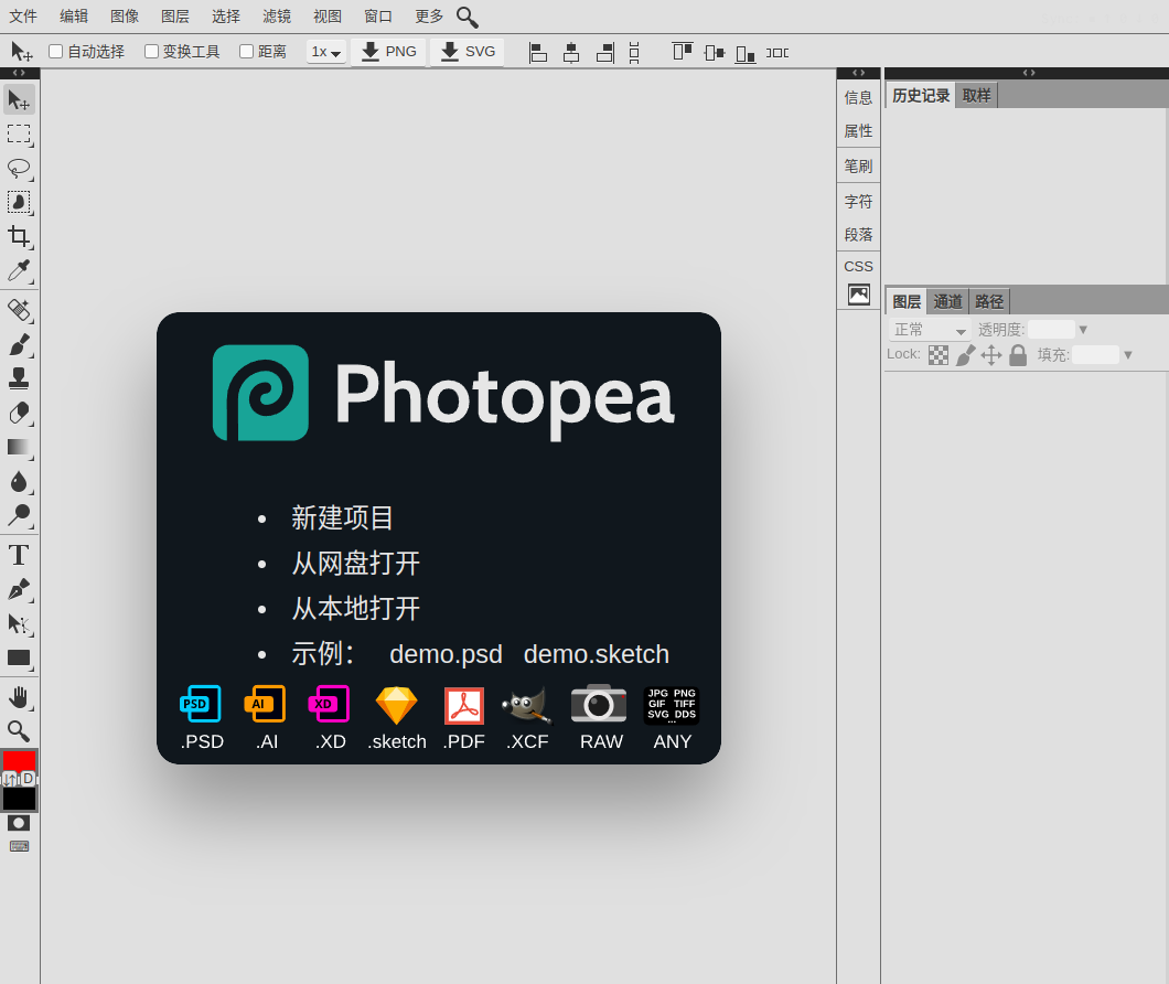 可以去官方直接使用:photopea。 如果慢的话,国内的 kodbox 是个开放的私有云产品,里面集成了 photopea,懒得部署的也可以直接点开用,效果如下