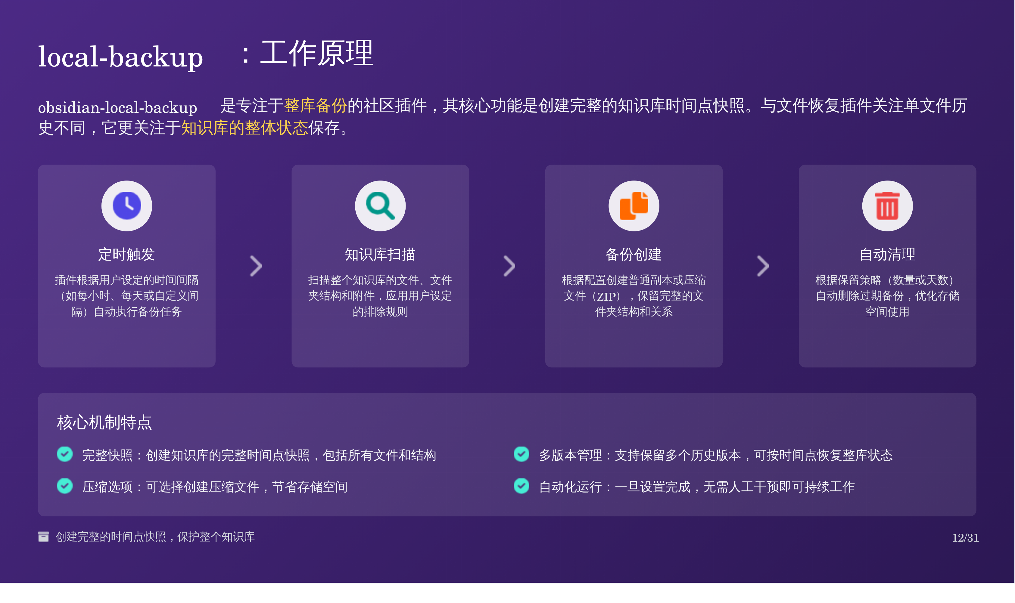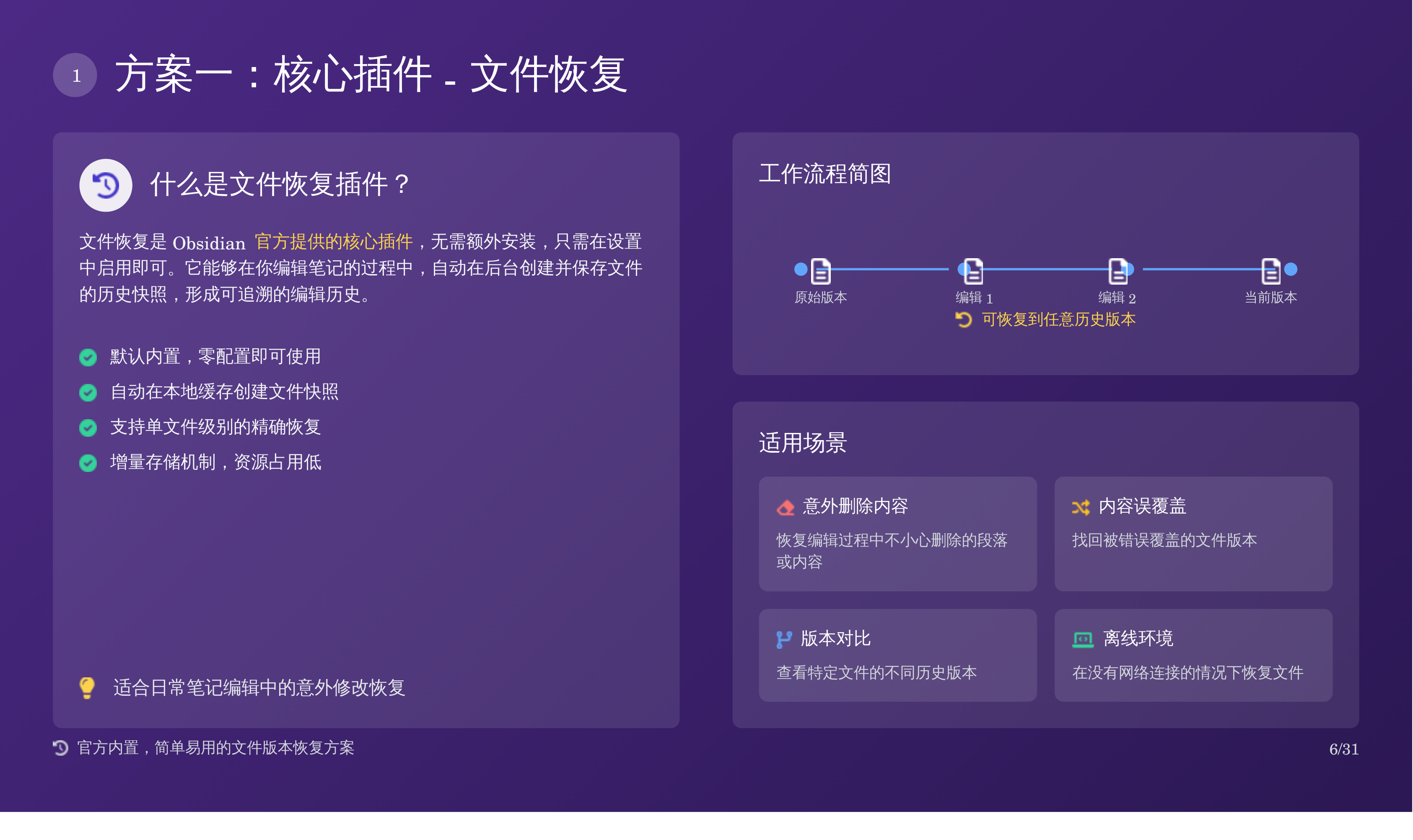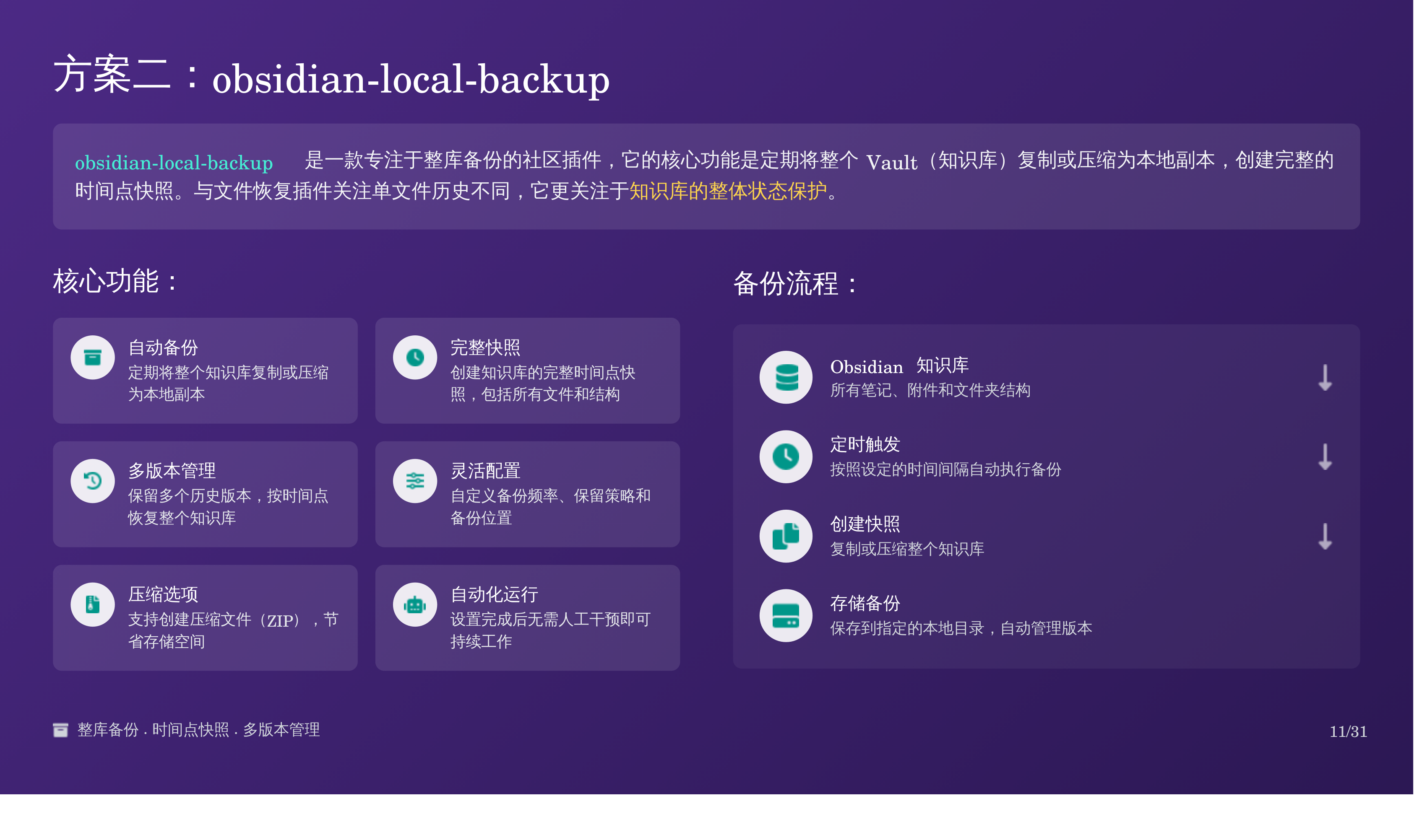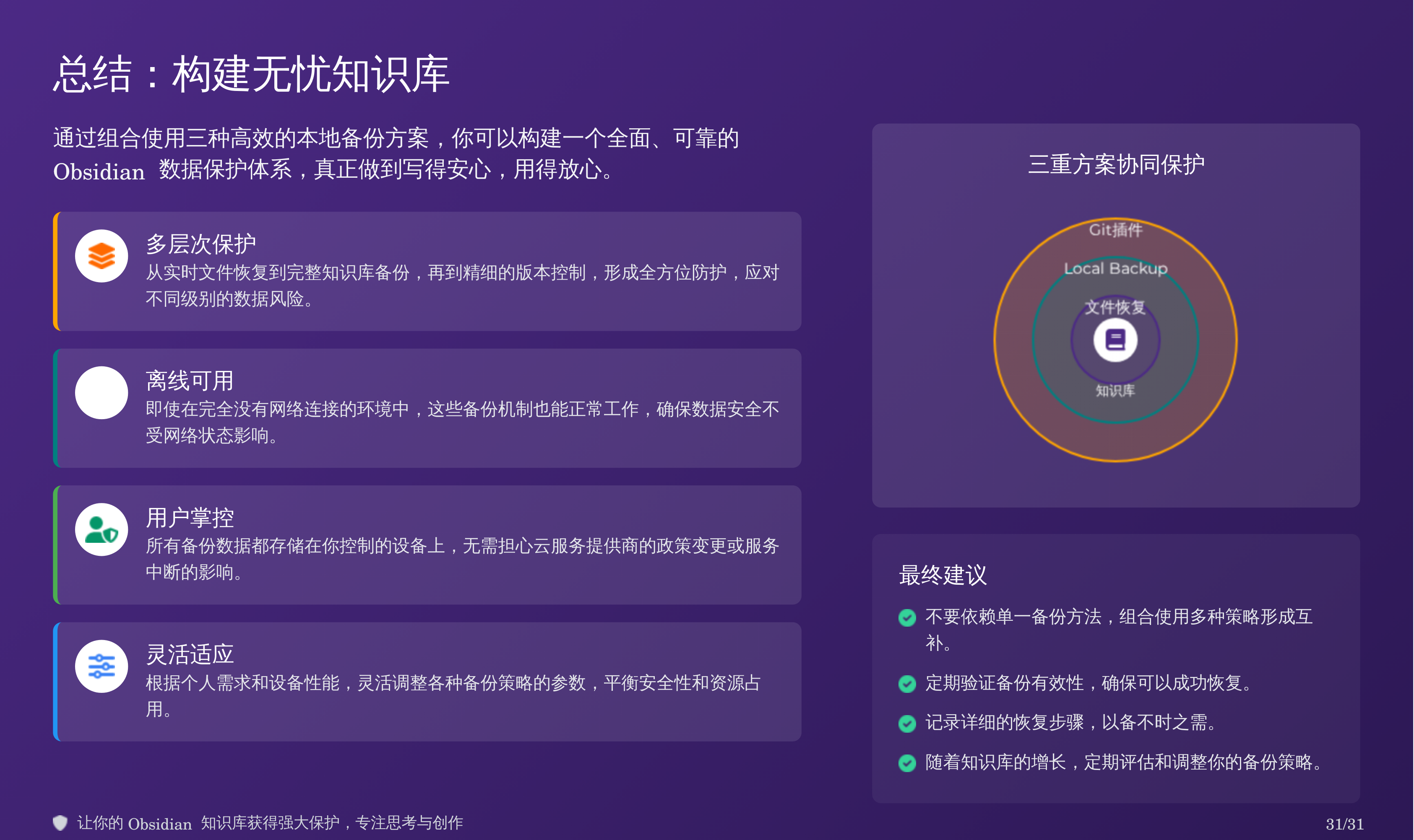 比如我上次分享的那篇 Obsidian 备份全攻略:三重方案搞定误删恢复,我用天工 AI 自动生成了对应的 PPT,效果如下: