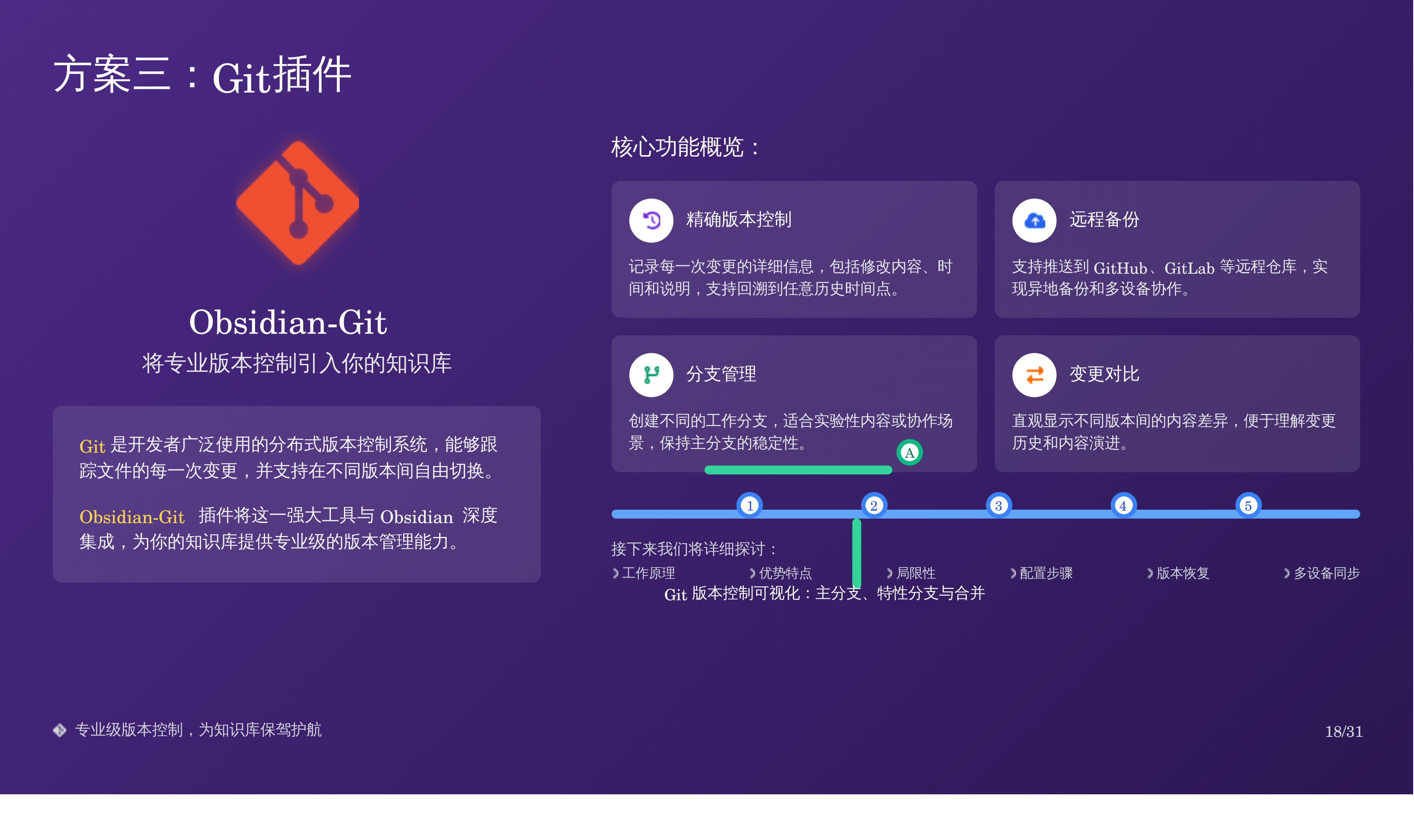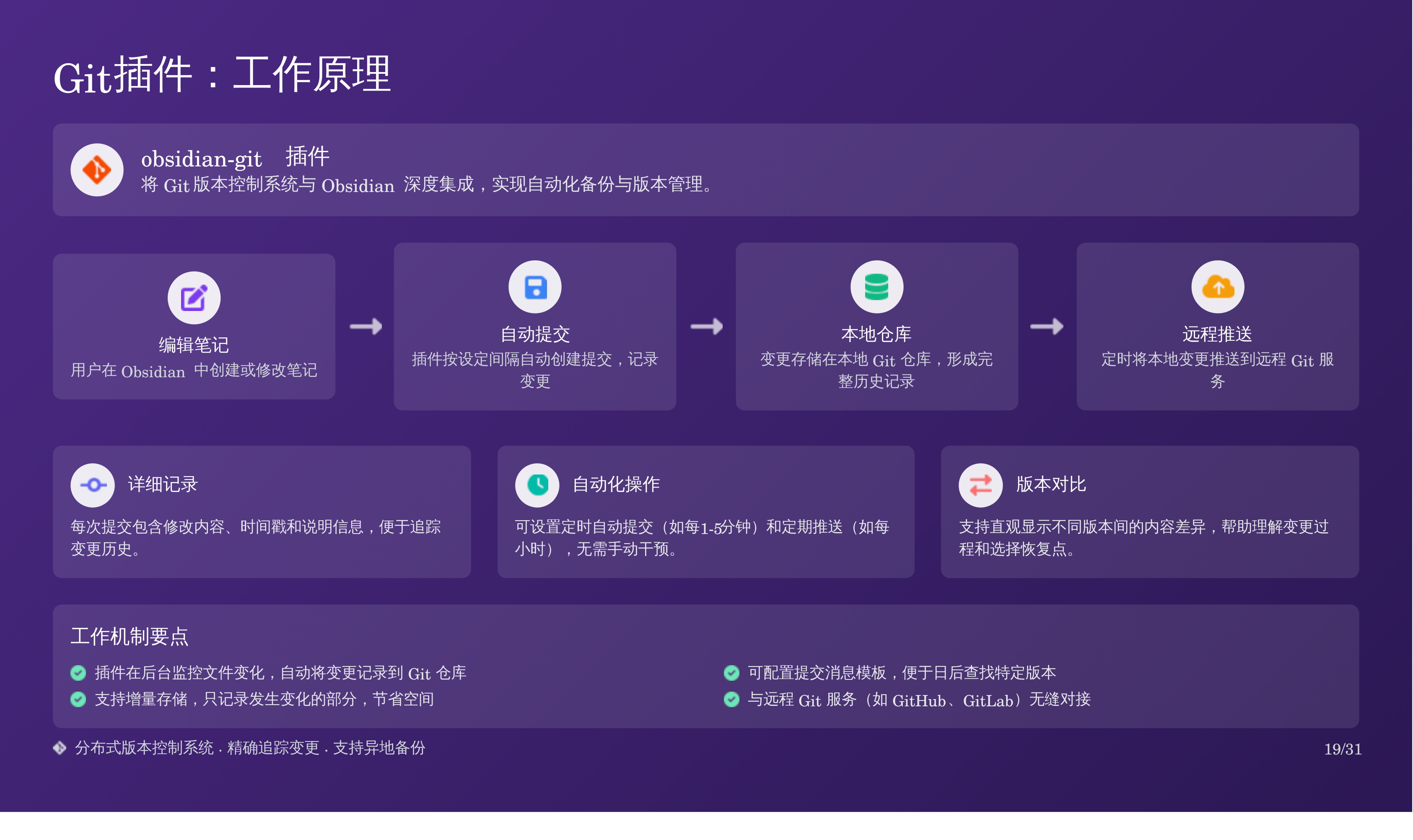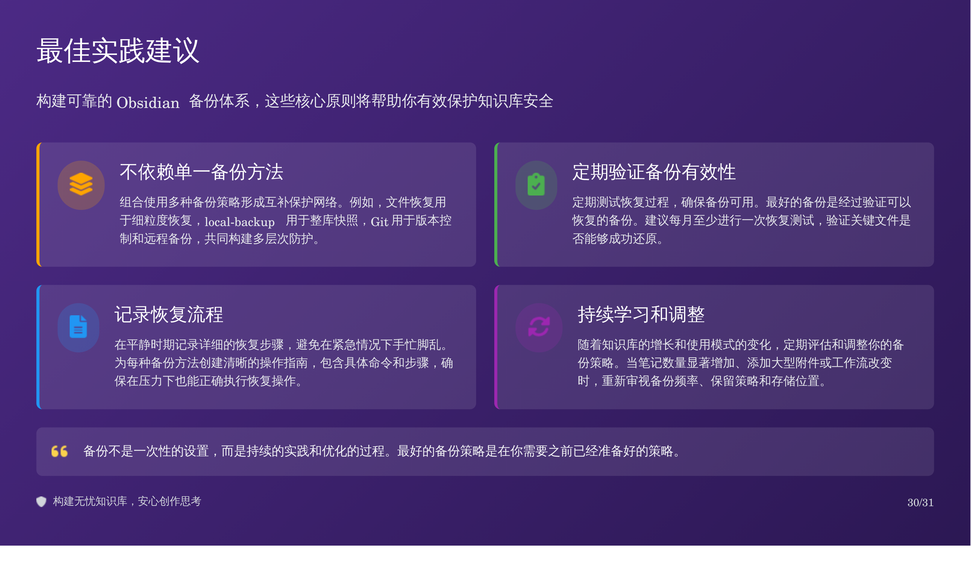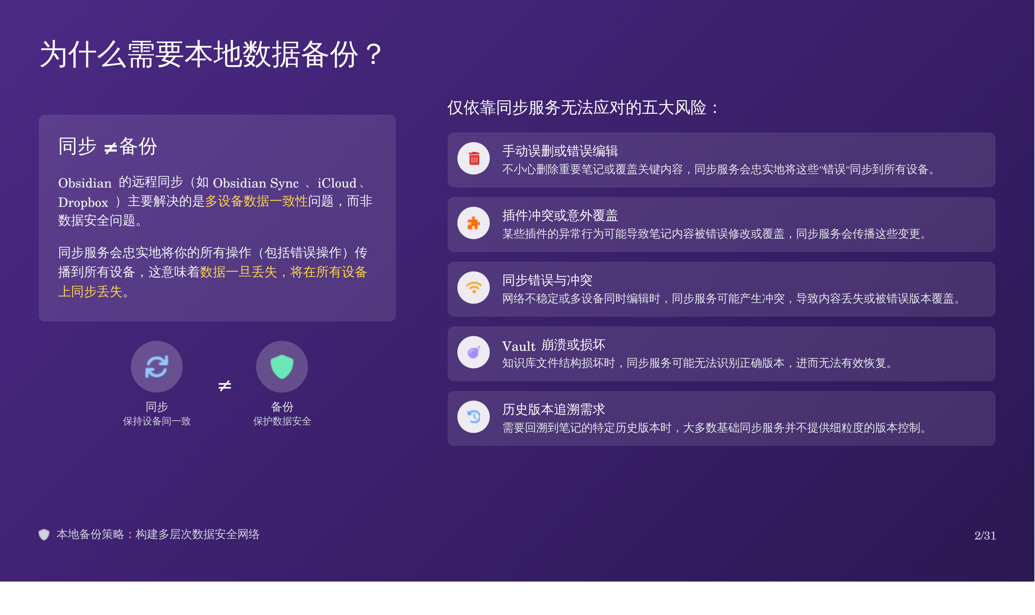 比如我上次分享的那篇 Obsidian 备份全攻略:三重方案搞定误删恢复,我用天工 AI 自动生成了对应的 PPT,效果如下:
