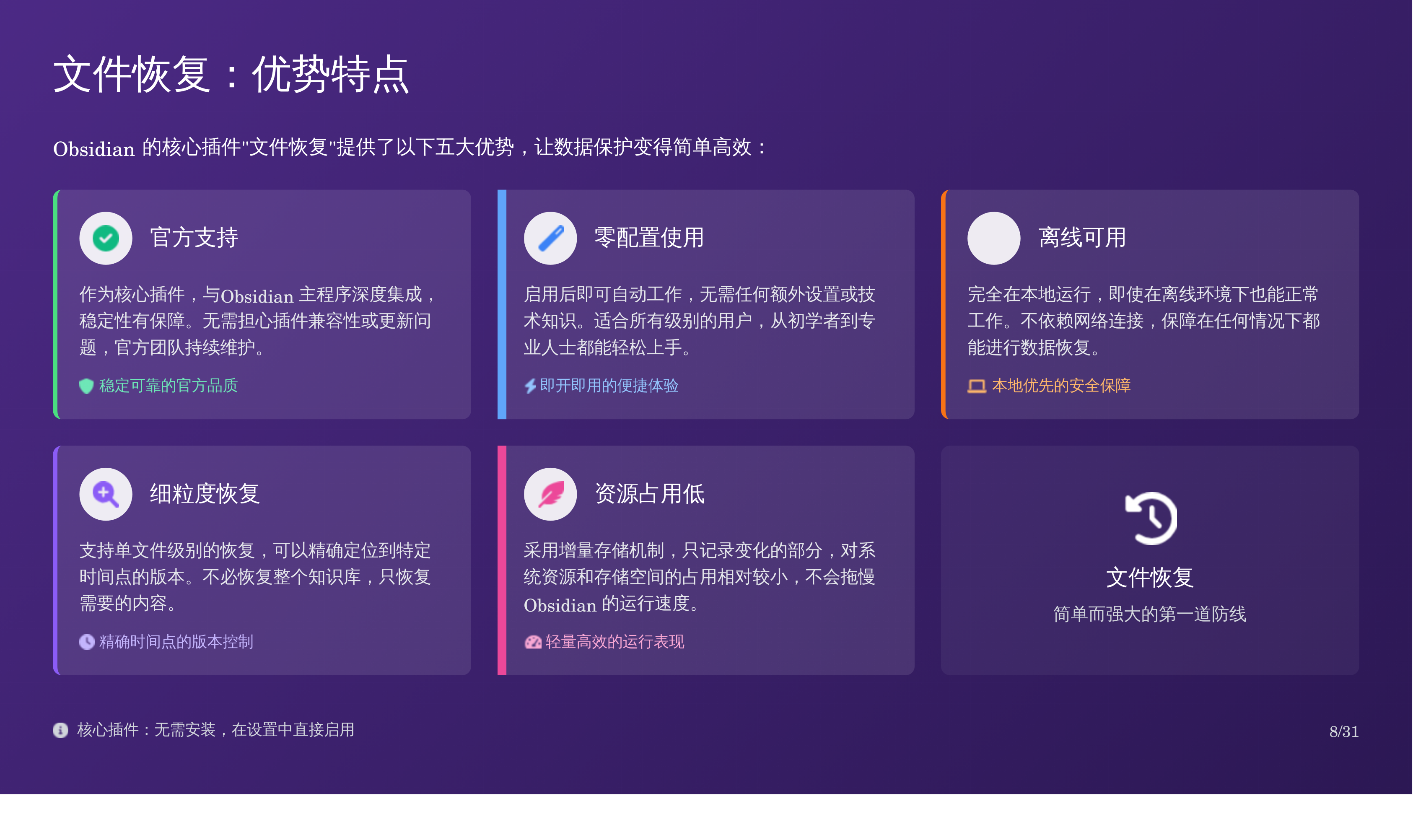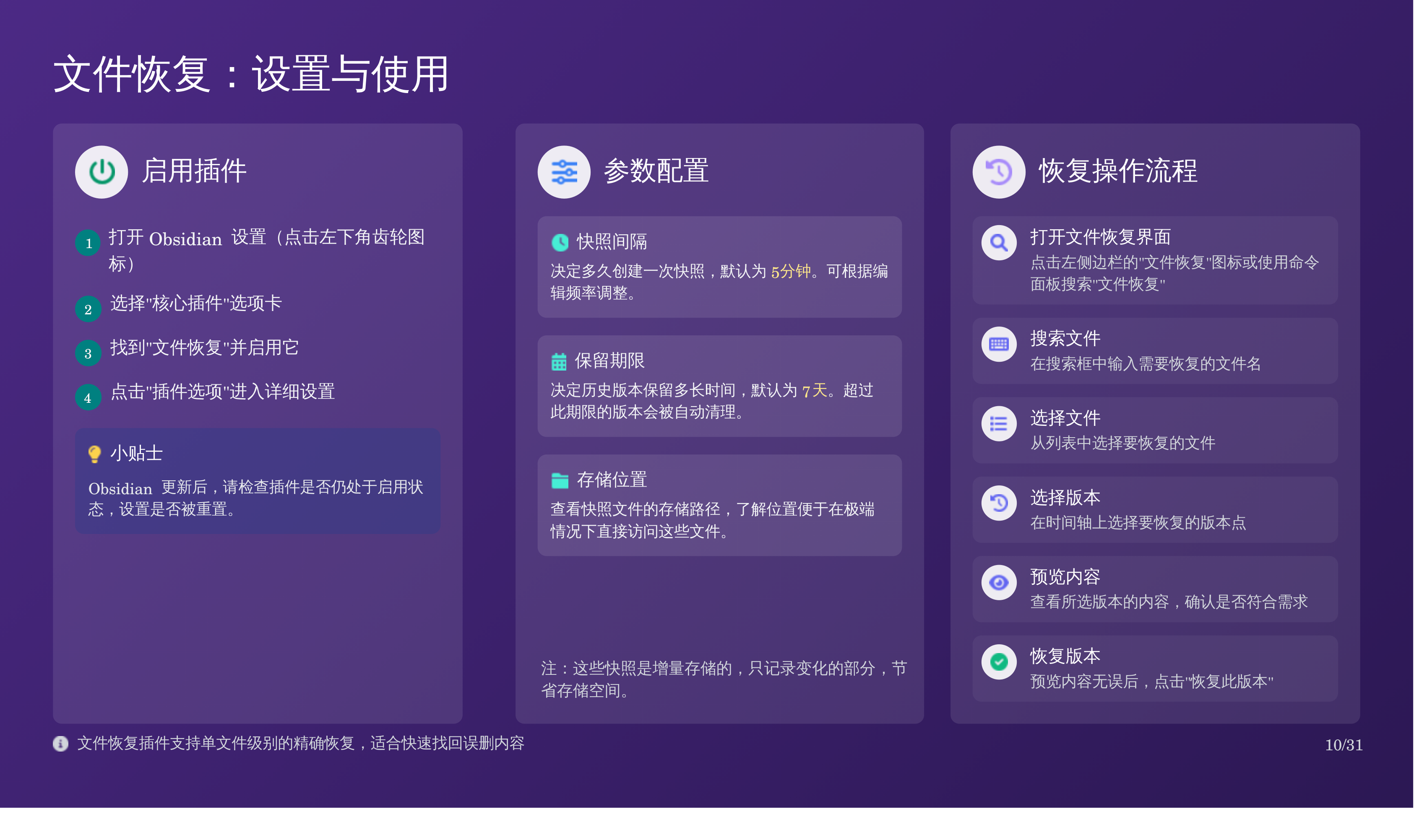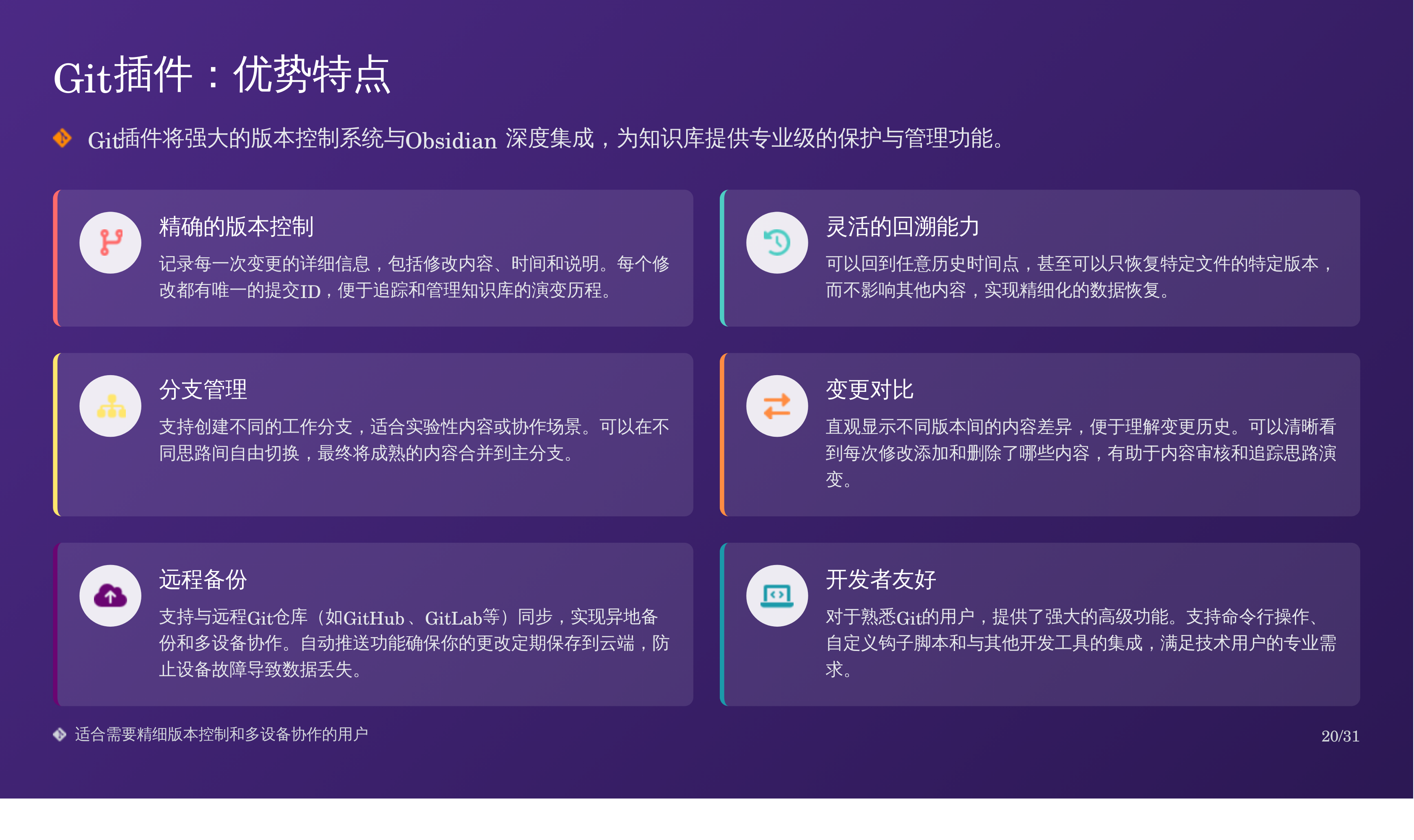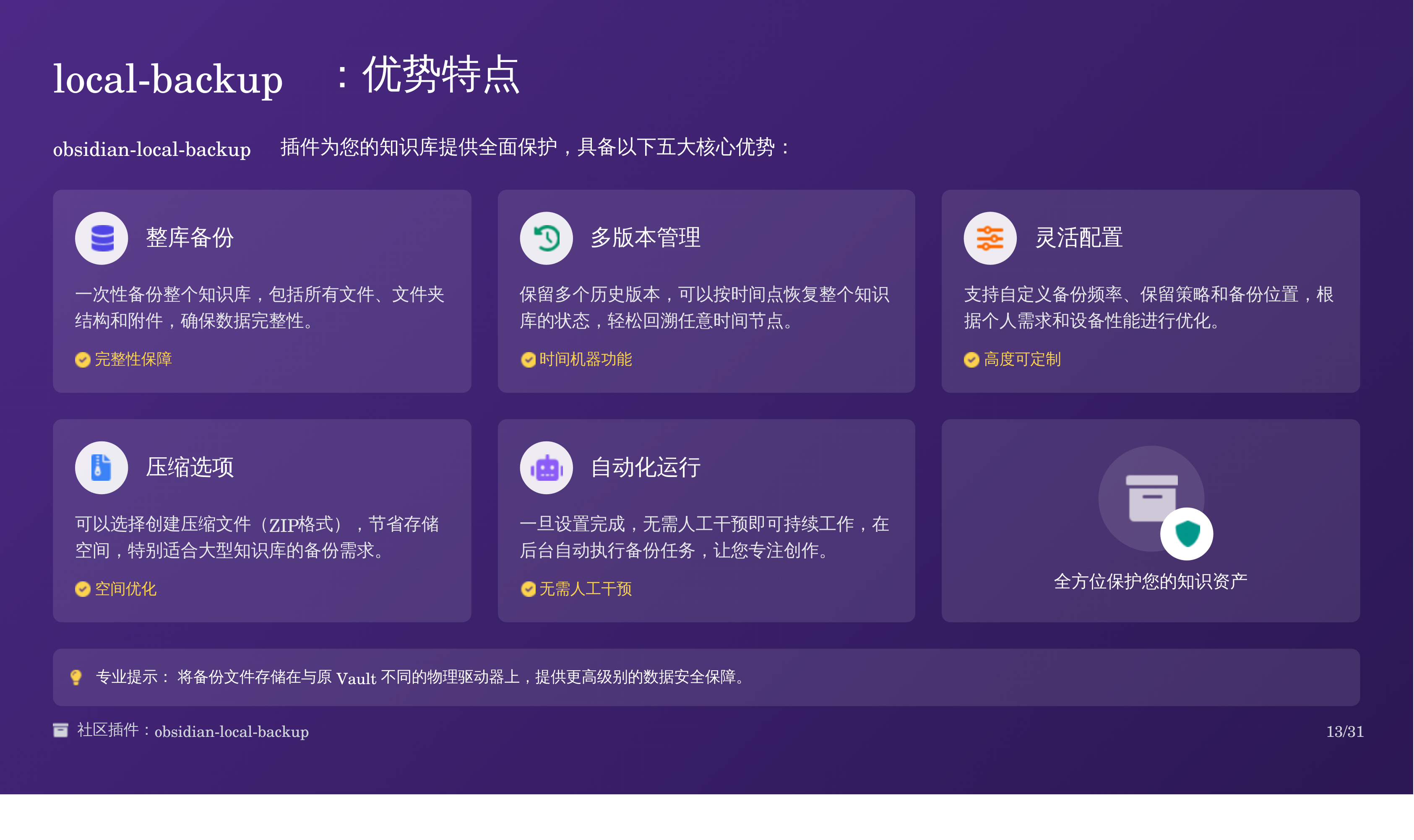 比如我上次分享的那篇 Obsidian 备份全攻略:三重方案搞定误删恢复,我用天工 AI 自动生成了对应的 PPT,效果如下:
