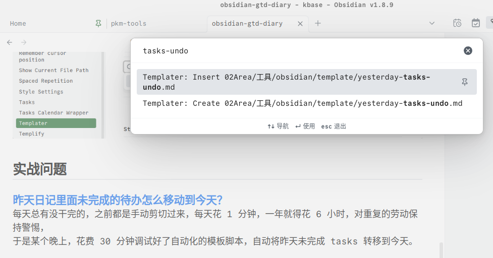 • 笔记模板:obsidian-templater,按模板生成日记,自动化移动昨天未完成的待办到当天