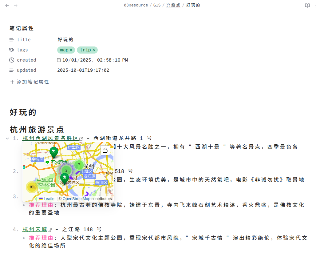 我改造了一个地图插件,专门适配了国内的高德地图和坐标系,让你的知识库从此有了酷炫的 地理维度。这篇文章会带你一步步构建自己的可视化地图系统,把零散的足迹汇集成独特的人生故事。