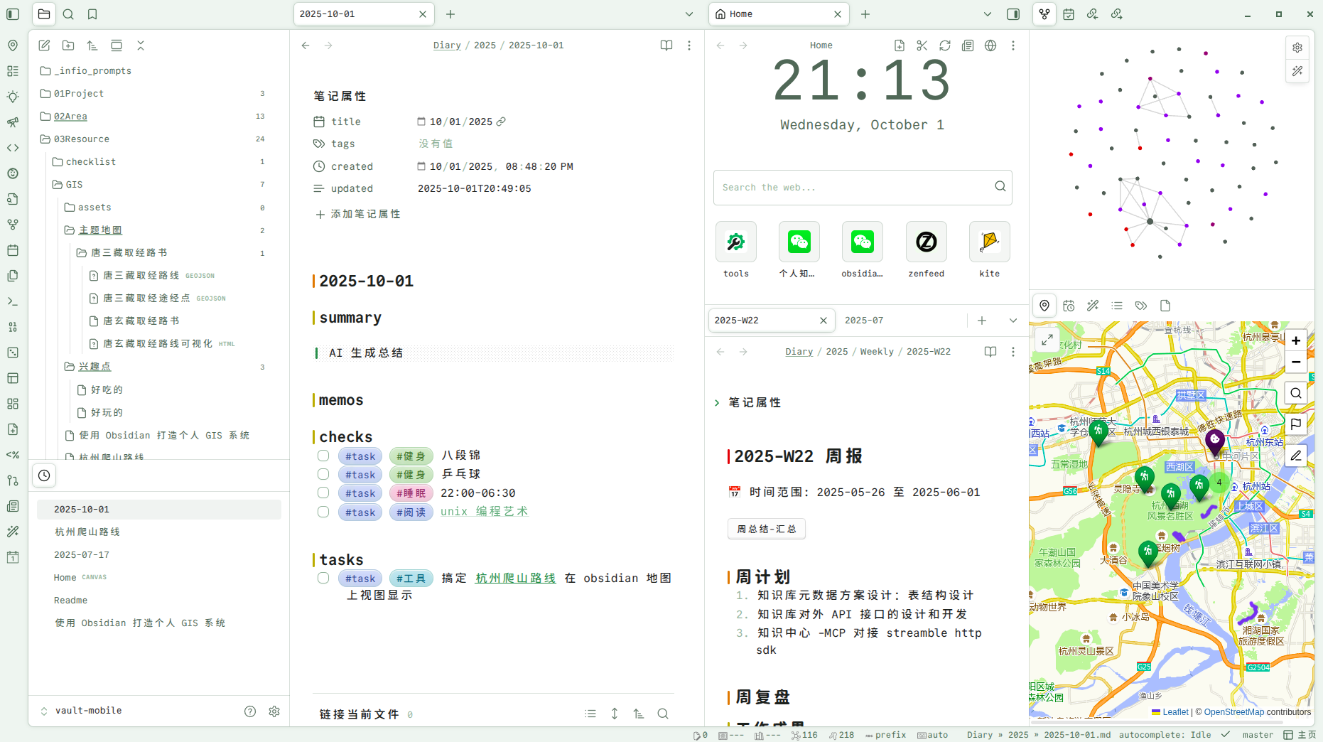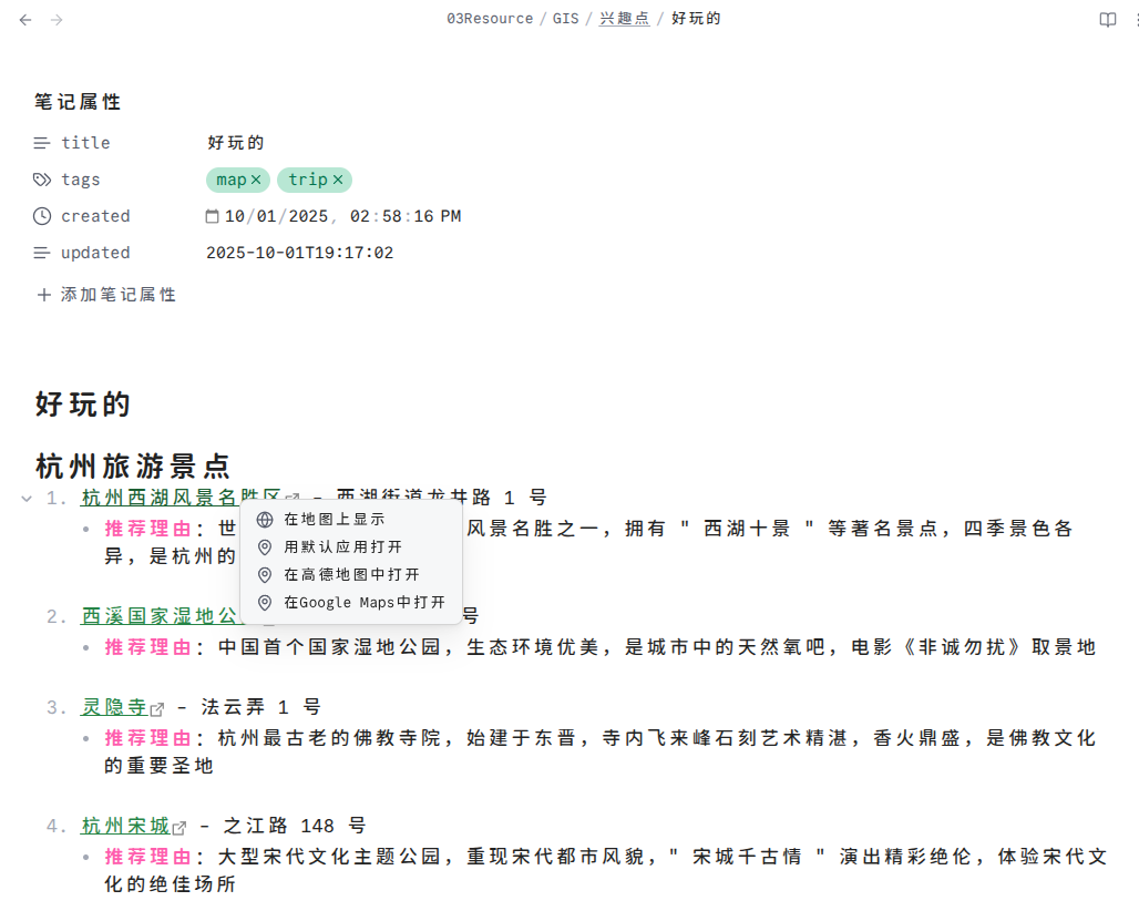 就像笔记有 MOC 一样,我觉得地图是一个很好的个人信息可视化入口,今天就来分享如何使用 Obsidian 打造个人地图管理 GIS 系统,可是花了我一点时间搞定国内高德地图的适配,希望对把 Obsidian 构建个人知识库的朋友有所启发。