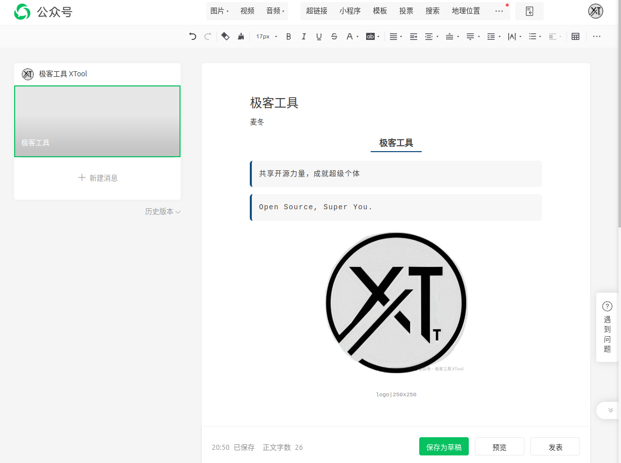 公众号后台收尾:打开微信公众号 - 文章编辑页面,粘贴内容,保存草稿后者定时发布即可。